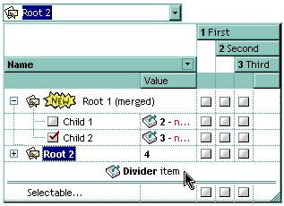 A divider item uses the item's client area to display a single cell. The ItemDivider property specifies the index of the cell being displayed. In other words, the divider item merges the item cells into a single cell. Use the ItemDividerLine property to define the line that underlines the divider item. Use the LockedItemCount property to lock items on the top or bottom side of the control. Use the MergeCells method to combine two or multiple cells in a single cell. Use the SelectableItem property to specify the user can select an item. A divider item has sense for a control with multiple columns.