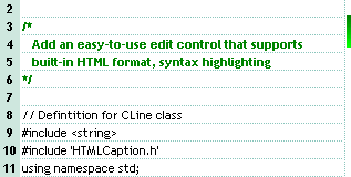 m_edit.AddExpression("<b><fgcolor=008000>/*</fgcolor></b>", "<b><fgcolor=008000> </fgcolor></b>", "<b><fgcolor=008000>*/</fgcolor></b>", COleVariant( VARIANT_TRUE ), vtMissing );The following VB.NET sample adds and a new expression to highlight the text between /* and */: