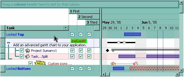 #include "Items.h" m_gantt.BeginUpdate(); CItems items = m_gantt.GetItems(); items.SetLockedItemCount( 0 /*TopAlignment*/, 1); long i = items.GetLockedItem( 0 /*TopAlignment*/, 0 ); COleVariant vtItem(i), vtColumn( long(0) ); items.SetCellCaption( vtItem, vtColumn, COleVariant( "<b>locked</b> item" ) ); items.SetCellCaptionFormat( vtItem, vtColumn, 1/*exHTML*/ ); m_gantt.EndUpdate();