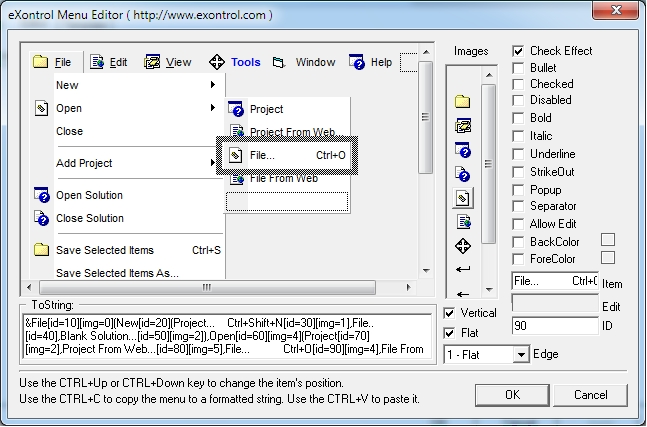 Is there any way to get this formatted string from the control's editor? Open the control in design mode, select the Properties item in its context menu, and locate the Editor page, where you find the "Invoke Internal Editor" button, click it, and the control's Editor page is opened. Build your menu. Click an item, so it becomes focused, and press the CTRL + C, a beep should be hear. Now, open a notepad editor, and press CTRL + V, you should get the formatted string for ToString method. Click the designer, so no item is focused, and press the CTRL + C key, and so the entire menu is copied to the clipboard, as ToString syntax.