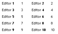 With Record1 .BeginUpdate .FieldWidth = 96 .Layout = exLeftToRight Dim i As Long For i = 1 To 10 With .Add("Editor <b>" & i & "</b>", EditType) .Value = i End With Next .EndUpdate End With