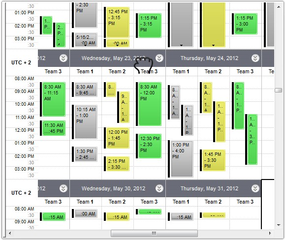 By default, the AllowResizeSchedule property is exMiddleClick, which indicates that the user magnify or shrink ( zooming ) the scheduler view if dragging the mouse while the MIDDLE mouse button is pressed. The AllowResizeSchedule property allows the user to magnify or shrink ( zooming ) the scheduler view with a click. The AllowMoveSchedule property allows the user to move or navigate the schedule view to a new position, without selecting a new date in the calendar panel. The AllowExchangePanels property allows the user to move a panel from a side to another. The LayoutStartChanging(exScheduleResize) event occurs once the user starts resizing the schedule view. The LayoutEndChanging(exScheduleResize) event occurs once the user resized the schedule view. The FitSelToView method restores the view to fit the selected dates. The ClipToSel property indicates whether the control clips the schedule panel to view the selected dates only.