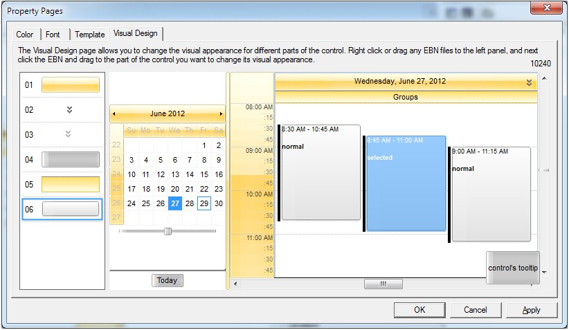 The following picture shows the control's VisualDesign form after applying some EBN objects: