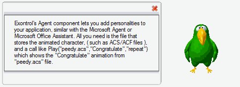| AgentFile as Variant | A String expression that specifies the ACS or ACF file to be loaded. Microsoft Agent characters are stored in files of the .ACS extension, and can be stored in a number of compressed .ACF files for better World Wide Web distribution. | |||