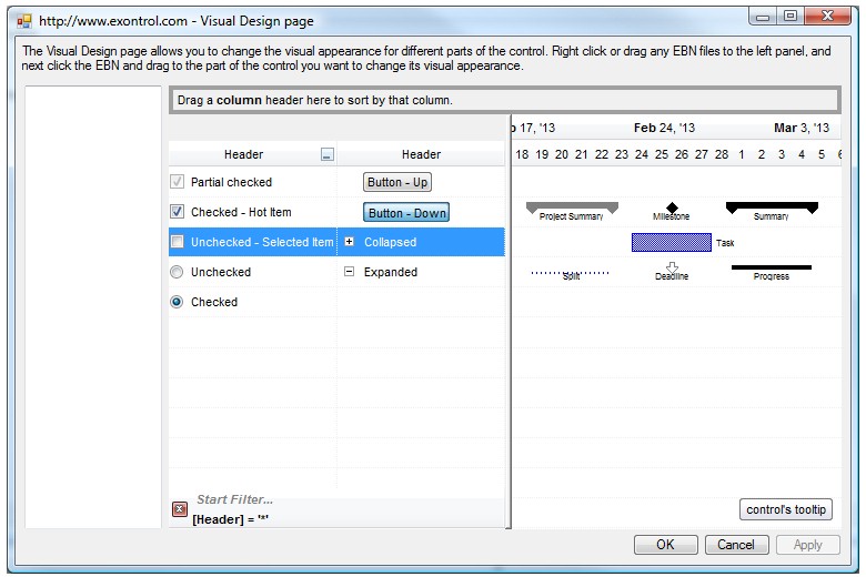 The following picture shows the control's VisualDesign form after applying some EBN objects: