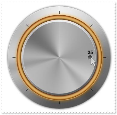' Change event - Occurs when the layer's value is changed. Private Sub Gauge1_Change(ByVal Layer As Long) With Gauge1 .ExtraCaption("Client",exLayerCaption) = .FormatABC("`<sha ;;0><font ;12><b>` + (100 - value format `0`)",Gauge1.Value) .ExtraCaption("Client",exLayerCaptionLeft) = .FormatABC("value - 8",Gauge1.Layers.Item(9).LayerToClientX(Gauge1.Layers.Item(9).RotamoveCenterX,Gauge1.Layers.Item(9).RotamoveCenterY)) .ExtraCaption("Client",exLayerCaptionTop) = .FormatABC("value - 26",Gauge1.Layers.Item(9).LayerToClientY(Gauge1.Layers.Item(9).RotamoveCenterX,Gauge1.Layers.Item(9).RotamoveCenterY)) End With End Sub With Gauge1 .BeginUpdate .PicturesPath = "C:\Program Files\Exontrol\ExGauge\Sample\Design\Circular\Knob" .PicturesName = "`Layer` + str(value + 1) + `.png`" .Layers.Count = 11 .AllowSmoothChange = exSmoothChangeless With .Layers.Item(9) .DefaultRotateAngle = -126 .OnDrag = exDoRotamove .RotateAngleToValue = "100 - (value / 360 * 100)" .ValueToRotateAngle = "(value)/100 * 360" .ValueToOffsetX = "value" .OffsetToValue = "value" .RotateAngleValid = "int(value / 360 * 100)/100 * 360" End With With .Layers.Item(7) .OnDrag = exDoRotate .RotateType = exRotateBilinearInterpolation End With .Value = 25 .EndUpdate End With