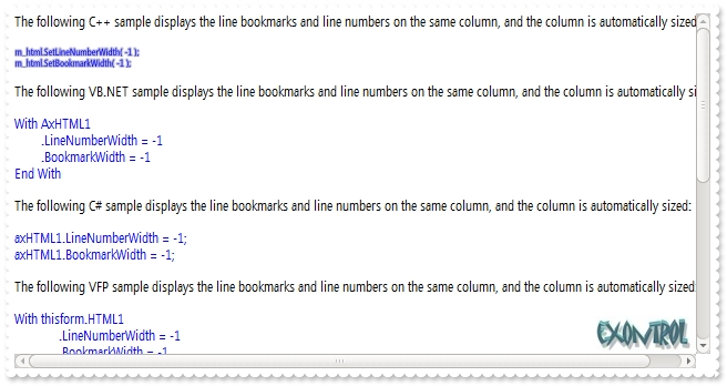 Use the Picture and PictureDisplay properties to put a picture on the control's background. If the Picture property is empty no picture is displayed on the control's background. The VB provides method like LoadPicture that loads a picture from a file. Use the BackColor and ForeColor properties to define the control's background and foreground colors. Use the BackColorAlternate property to specify the background color for alternate lines. The BackColorLocked property specifies the control's background while it is locked. The Locked property specifies whether the control is read-only.