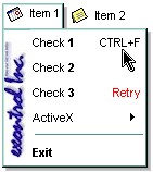 By default, the SepAcc property is ' ' ( 5 space characters ). If the item's Caption contains a string defined by the SepAcc property it delimits the left side of the caption, and the right side of the caption. For instance, if you need to display the File caption on the left side of the item, and CTRL+F in the right side of the item, you need to declare an item's caption like: "File CTRL+F". As you can see there are about 5 spaces between 'File' and 'CTRL+F' strings. When the item is displayed, the File caption will be aligned to the left side of the item, since the 'CTRL+F' string will be aligned to right side of the item. Use the Picture property to load a picture on the popup menu.