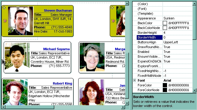 The control's client area excludes the size of the borders. Use the BorderWidth and BorderHeight properties to define the size of control's borders. The BorderWidth property is specified in pixels. By default, the BorderWidth property is 10 pixels. Use the FixedWidthNode property to specify the size of nodes. Use the Font property to specify the control's font. The ChartHeight property gets the height in pixels required to display the entire chart. The ChartWidth property gets the width in pixels required to display the entire chart.