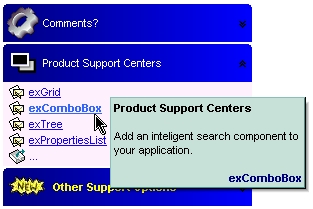 By default, the item's tooltip is "...". If the ToolTip property is empty, the control displays no tooltip when the cursor hovers the item. If the ToolTip property is "..." the control displays the item's Caption if it doesn't fit the control's client area. Use the GroupToolTip property to specify the tooltip for the group. Use the ToolTipDelay property to specify the time in ms that passes before the ToolTip appears. In this case the control displays no tooltip when the cursor is over the item. Use the ToolTipWidth property to specify the width of the tooltip window. The ToolTip supports built-in HTML format as described here.