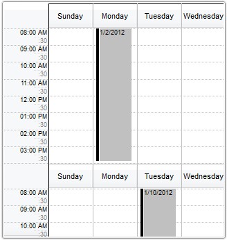 The following screen shot shows the control with time scale ( the schedule view has been resized using the MIDDLE mouse button ):