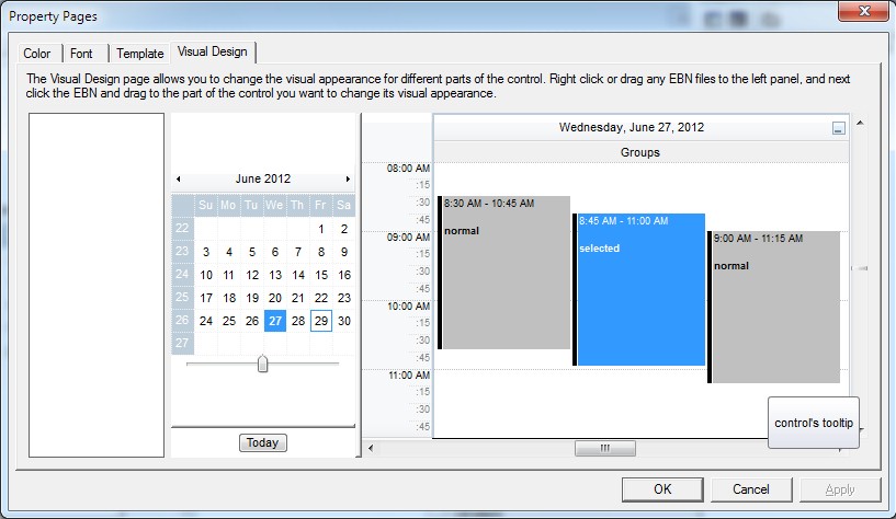 The following picture shows the control's VisualDesign form after applying some EBN objects: